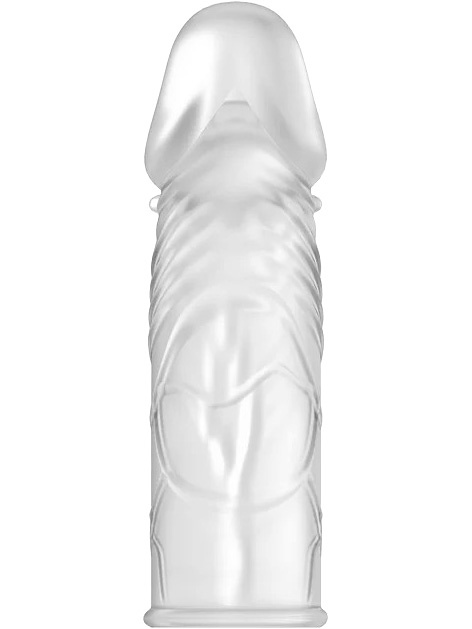 Made from transparent and flexible TPR-material, this sleeve fits snugly and comfortably around your penis. It instantly gives you an extra 2.5 cm of length and girth, while the structure enhances the natural sensation of penetration. The clear veining, its realistic top and textures around the glans add both visual and tactile stimulation.