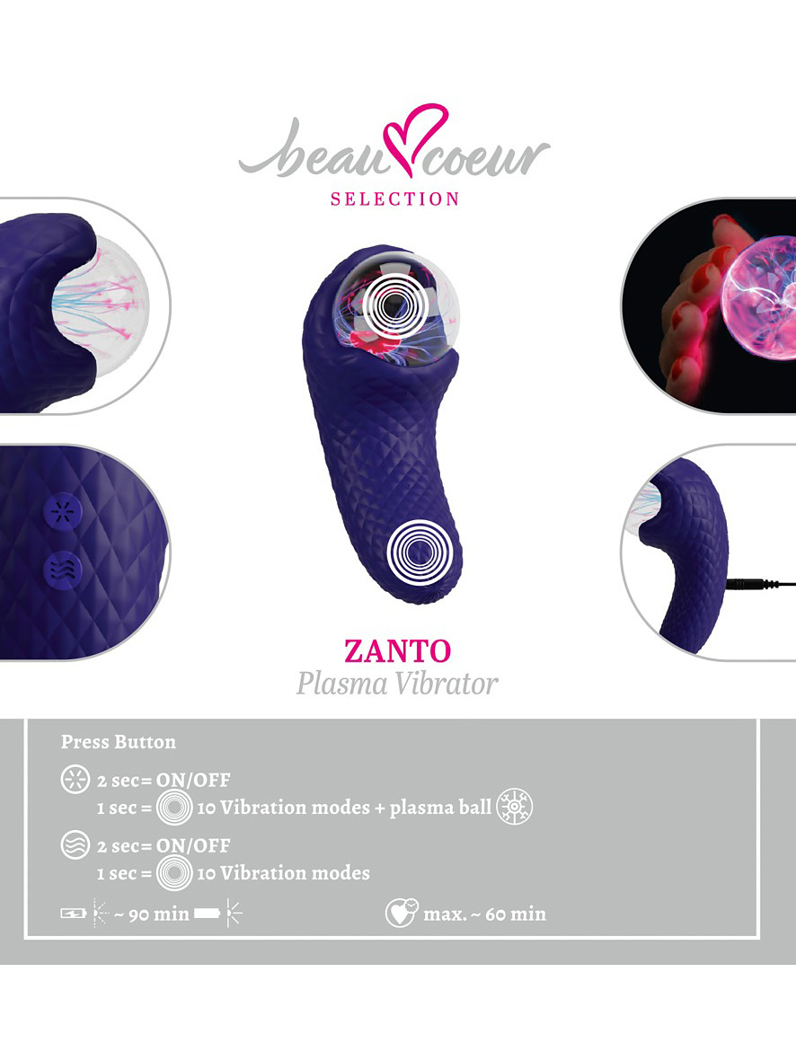 Seductive, futuristic and full of energy – the Zanto Plasma Vibrator from beau cœur turns every touch into an electric moment. With its unique glass plasma globe that lights up when it comes into contact with the skin, it invites you to a sensual experience that is as visual as it is physical. Perfect for those who want to combine intense pleasure with magic and aesthetics.