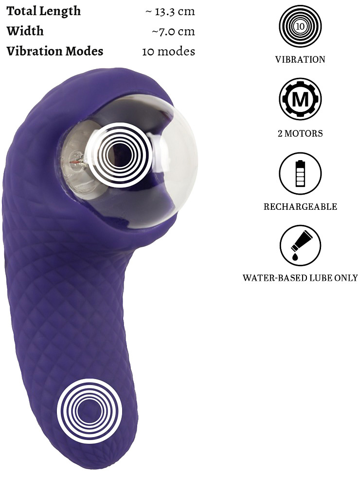 The rounded glass globe provides hypnotic clitoral stimulation and sensual light-effects during external play, while the other end with its elegant diamond structure offers deeper stimulation. You can use both sides separately or combine the vibrations for a customized experience.