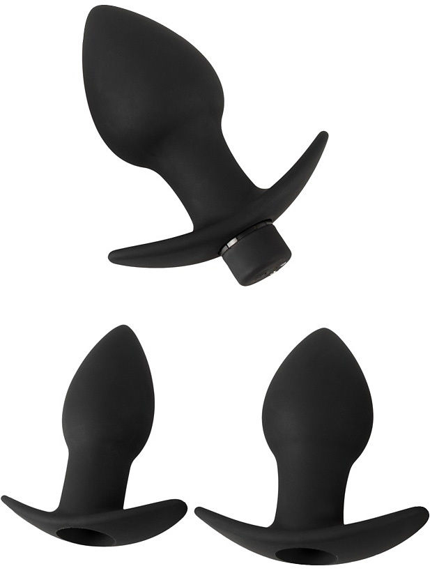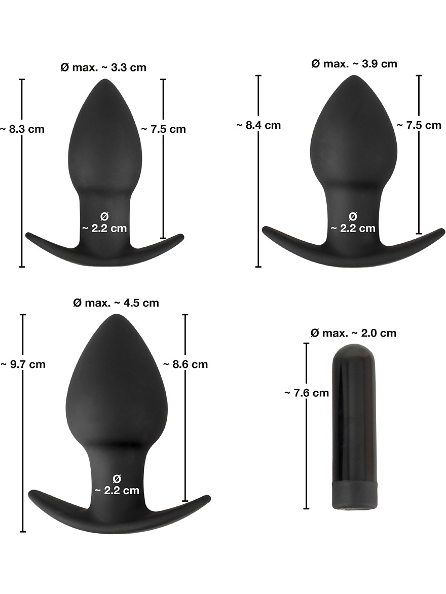 This set from Black Velvets includes three butt plugs and a bullet vibrator that you can place in the plugs for vibrating stimulation. The butt plugs are in different sizes and weights, perfectly suited for stretching training.