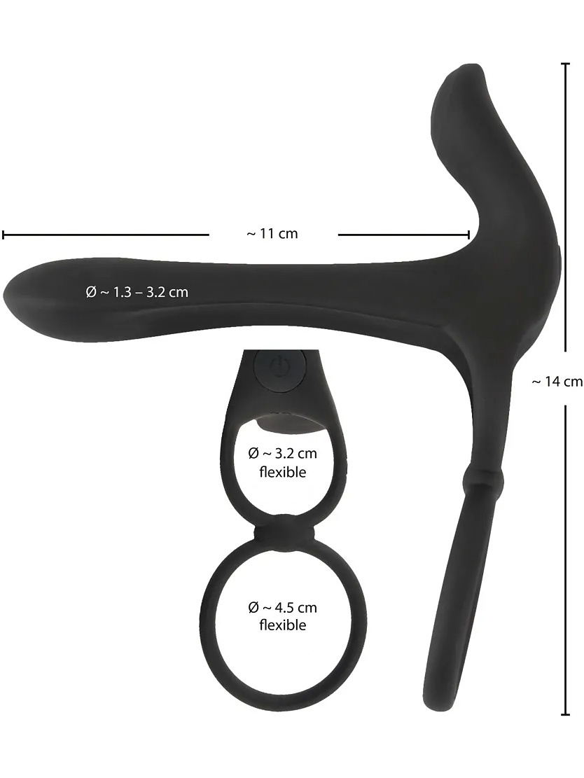 This is an exciting couple-vibrator with a penis- and scrotum-ring and vibrators that stimulate you both during sex. Thread one ring around your penis (3,2 cm) and the other around your scrotum (4,5 cm) so that the vibrator sits over your penis. Both rings are flexible and comfortable.