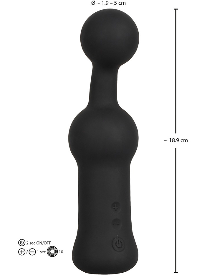 This is a uniquely shaped prostate vibrator with a ball-shaped top and a large ball a little longer on the flexible shaft that vibrates and stimulates the prostate and anus for a nice anal-massage.