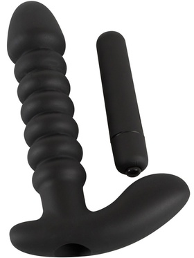 This anal vibrator is made of soft, bodysafe silicone with a lightly ribbed surface that enhances sensation with every movement. The tapered tip ensures easy insertion, and a bulge at the base provides pleasurable clitoral stimulation for women – or perineum stimulation for men. The vibrations are controlled via the built-in bullet vibrator at the base, giving you full control over intensity.