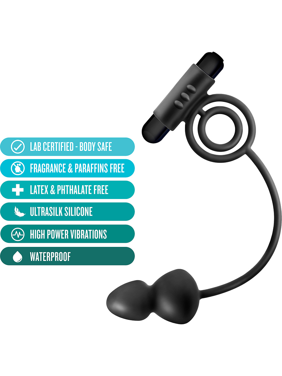 This unique product combines an butt plug, penis- and scrotum-ring and a bullet-vibrator for a pleasant stimulation and longer-lasting pleasure.