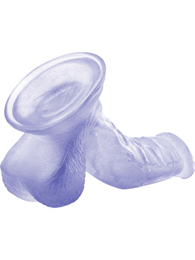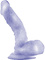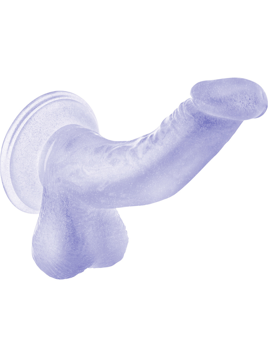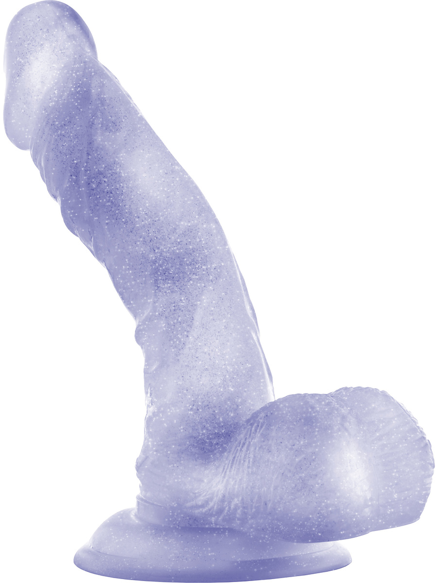 The dildo has a transparent purple color with shimmering silvery and purple glitter that gives it a playful feeling.