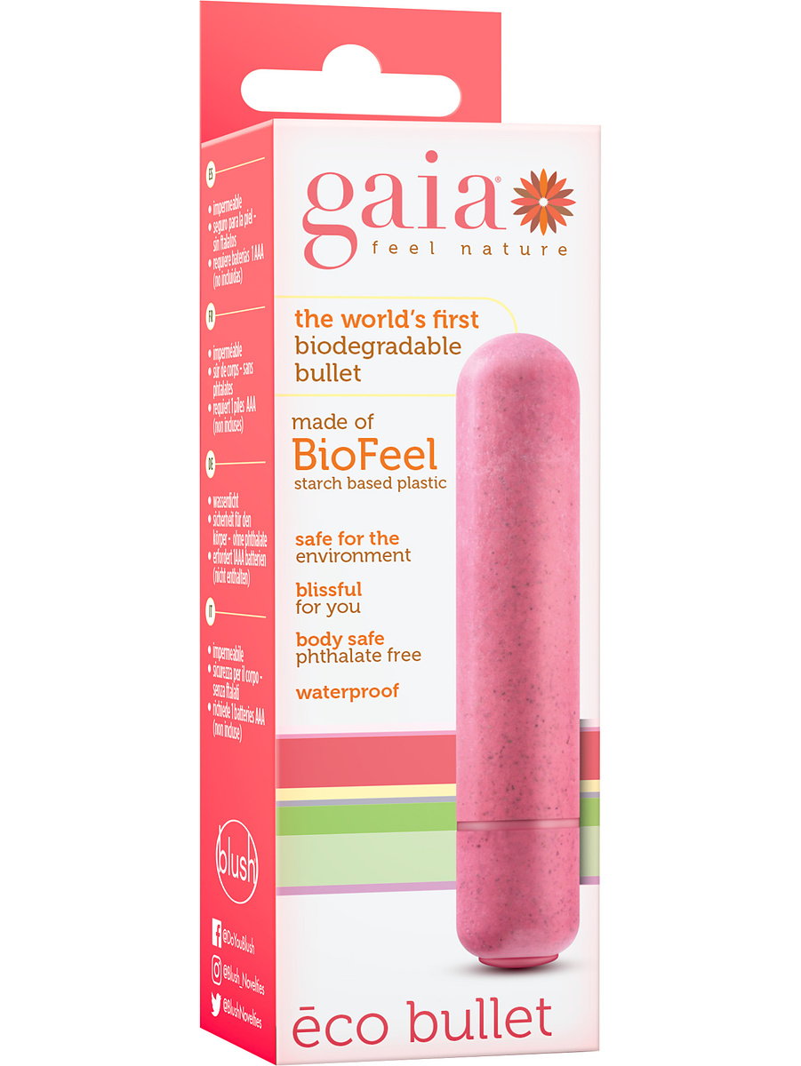 Gaia Eco is the world's first biodegradable and recyclable vibrator. It is made of Biofeel - a starch-based bioplastic. Gaia Eco uses less energy and emits fewer greenhouse-gases than any other sextoy on the market.
