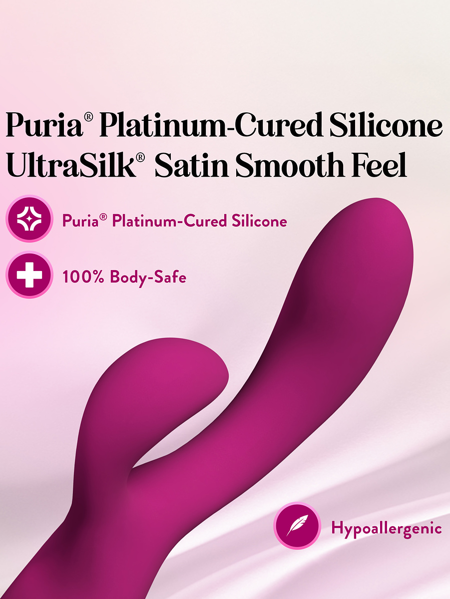 Quinn is made from Puria® platinum-cured silicone, which gives it a silky-smooth finish, making it irresistibly soft and bodysafe. It is IPX7 waterproof, making it perfect for both bath- and shower-play.