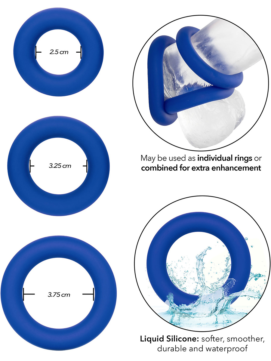 This is a set of three cockrings in different sizes that enhance the erection and provide optimal support. Each ring provides a tight and comfortable fit for a sensational experience every time.