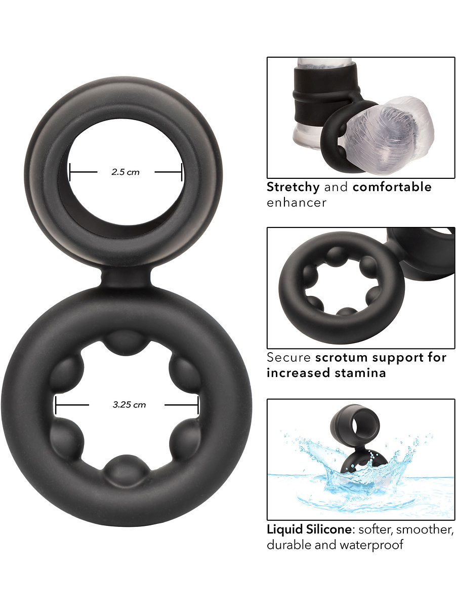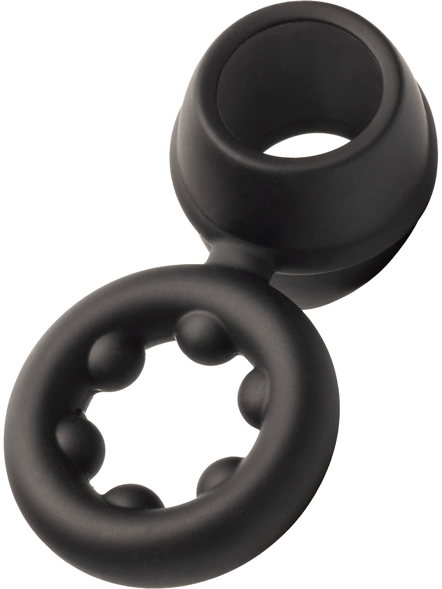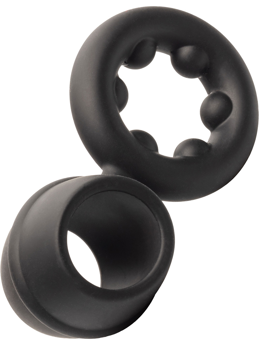 The cockring is made of super stretchy silicone and has a unique double design that provides maximum comfort and pleasure. Place the wide ring around the penis and let the ring with nodes sit around the scrotum.