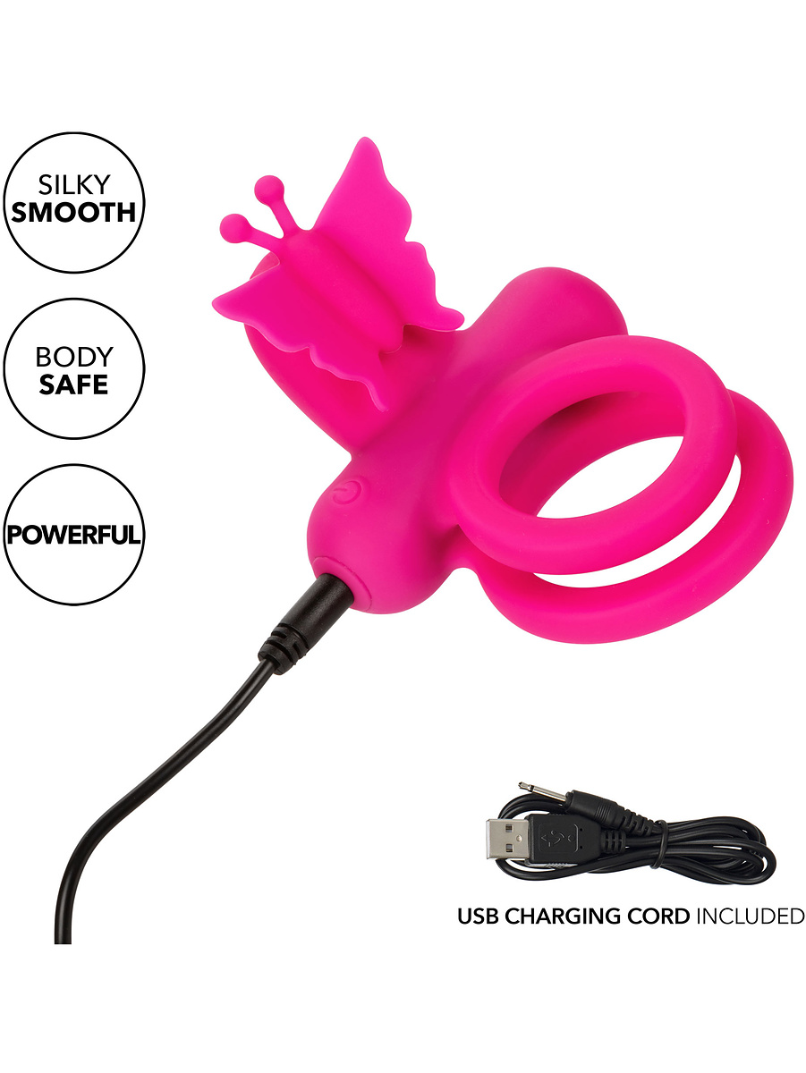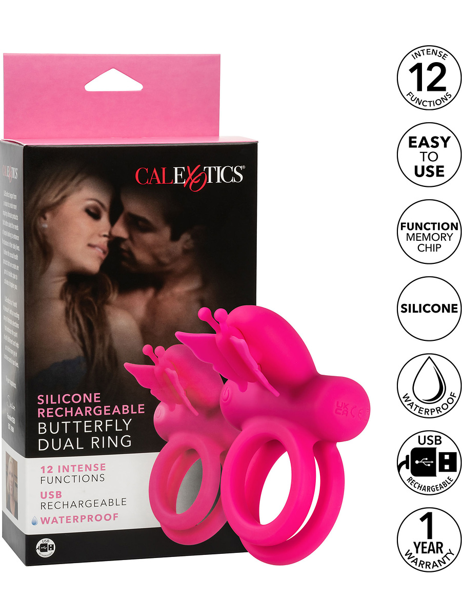 The Butterfly Dual Ring is a rechargeable cockring that offers 12 intense vibration-functions and a butterfly-stimulator for a fantastic stimulation. It is perfect for both beginners and experienced people who want to spice up their sexlife with extra pleasure.
