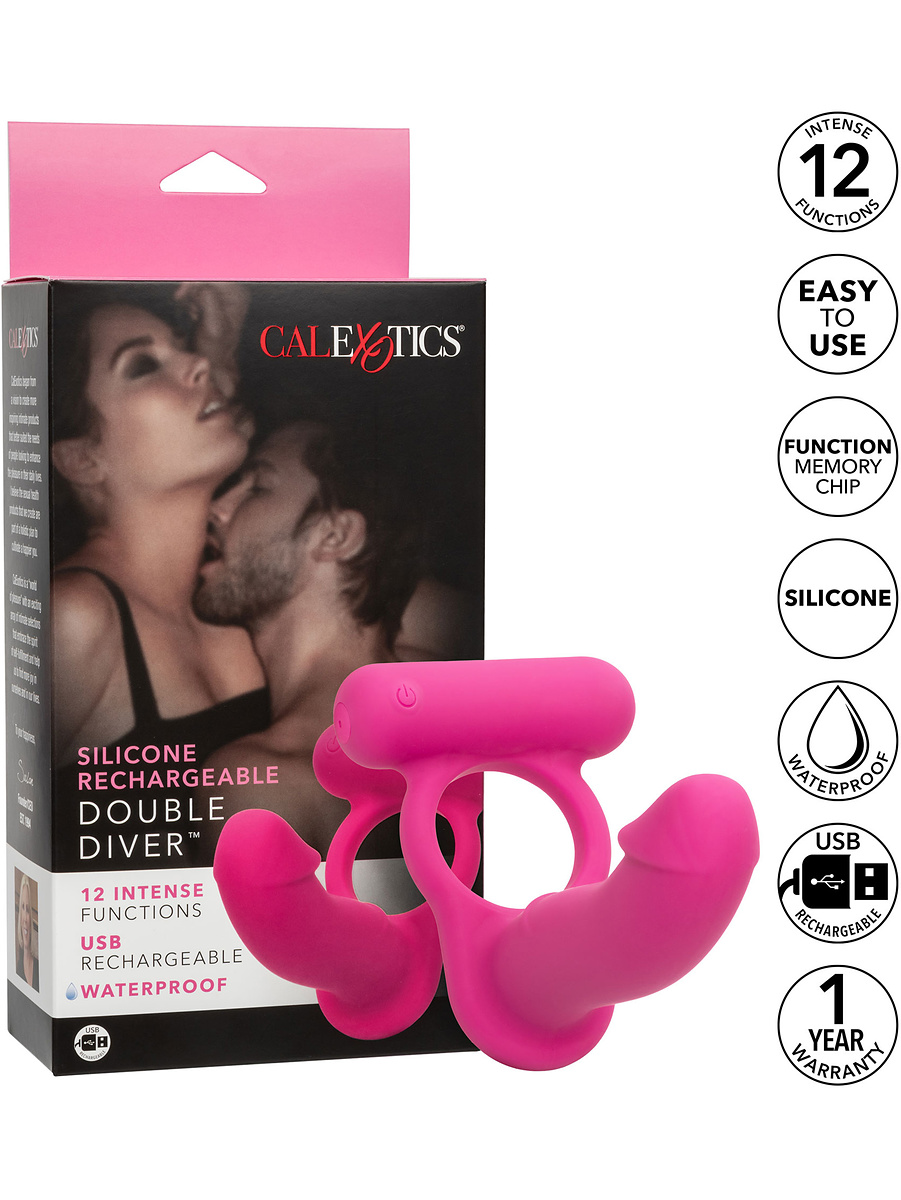 Double Diver is a vibrating cockring with dildo (9,5 x 2,5 cm) that allows your partner to enjoy double-penetration. While the stretchy ring embraces your penis, the vibrator and dildo will be at your partner's disposal. During penetration, your partner's clitoris will be stimulated by the vibrator at the same time as the slightly curved dildo penetrates her anally.