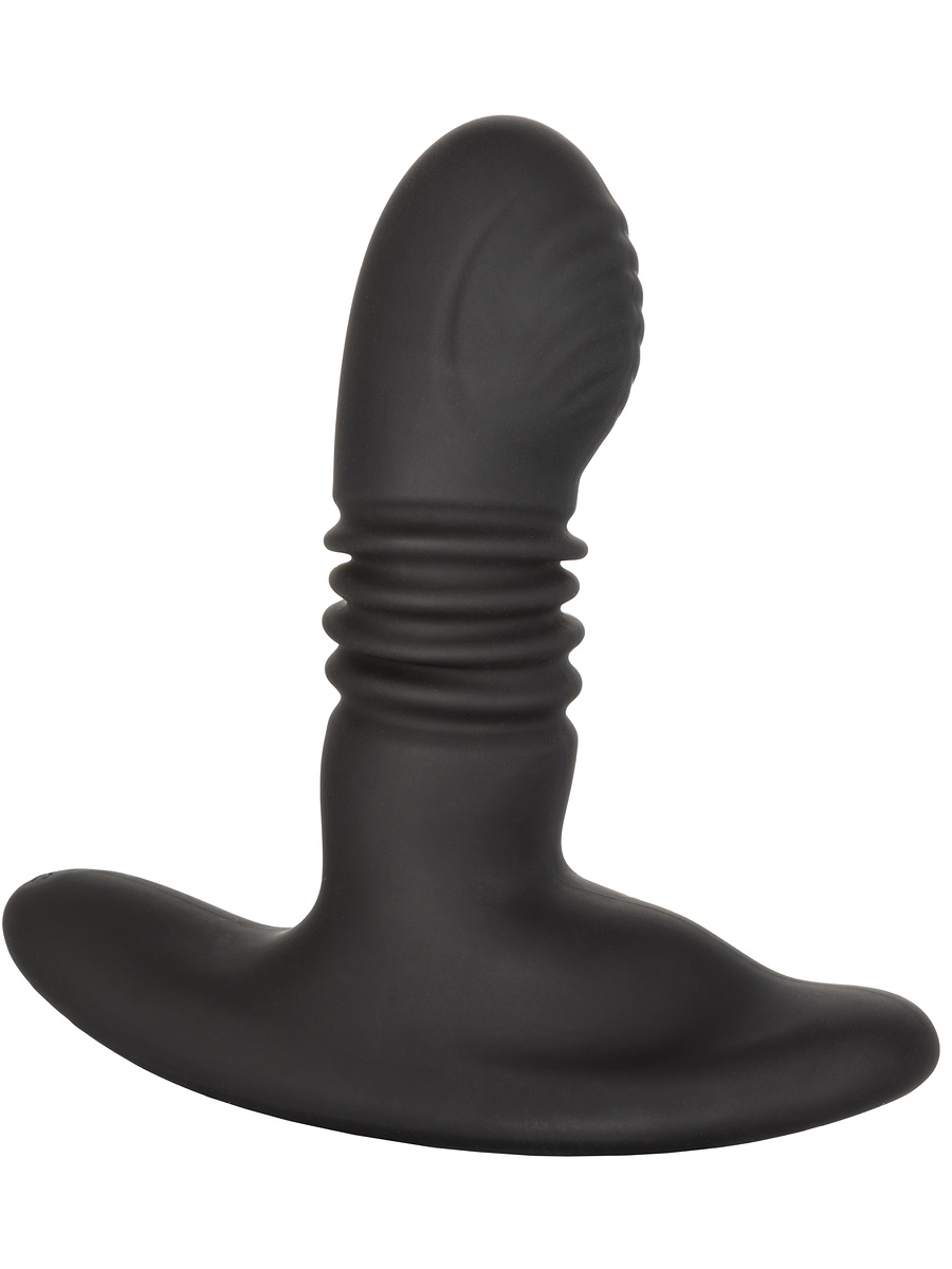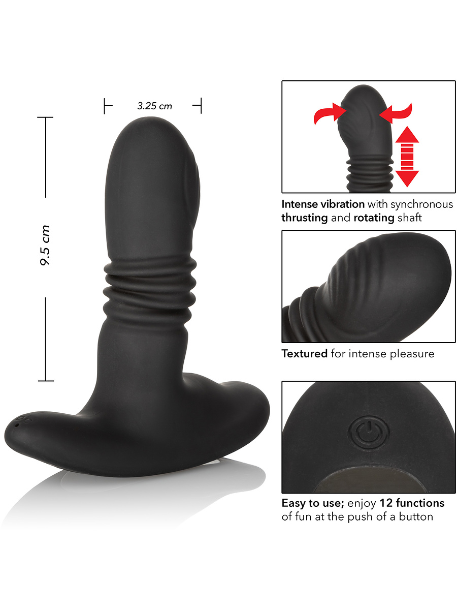This anal plug features a shaft that moves in and out while the tip rotates with a ribbed surface for extra stimulation. The shaft itself is ribbed as well, enhancing the feeling of the thrusting movements. The base is equipped with a powerful motor that delivers intense vibrations against the pelvic floor.