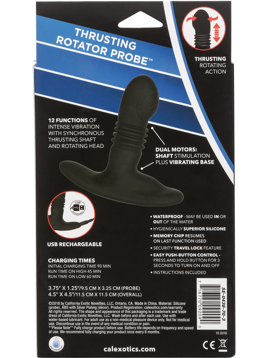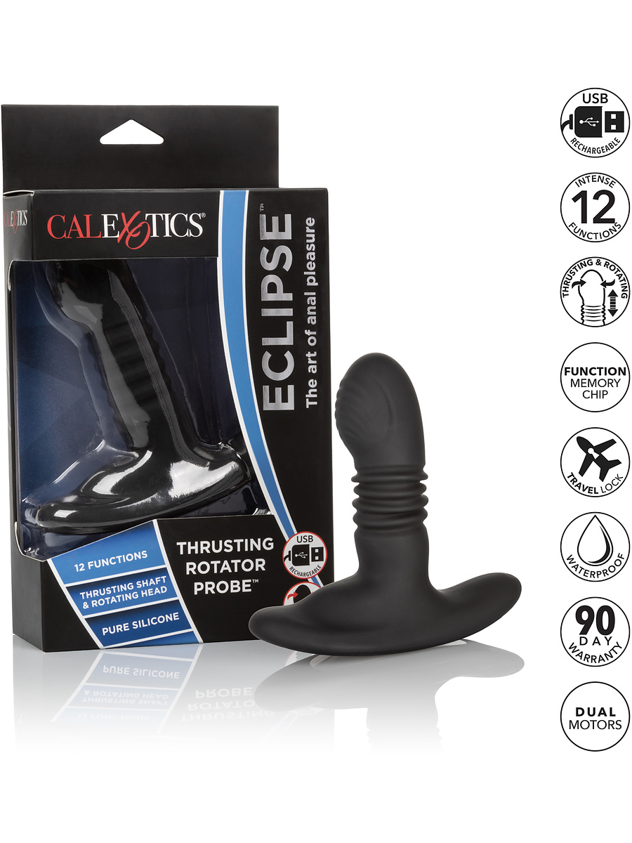 Eclipse, Thrusting Rotator Probe is also waterproof, allowing you to enjoy its functions both in and out of the water. It charges easily via USB and provides up to 60 minutes of intense stimulation. Give yourself the chance to explore new levels of pleasure with this powerful anal vibrator!
