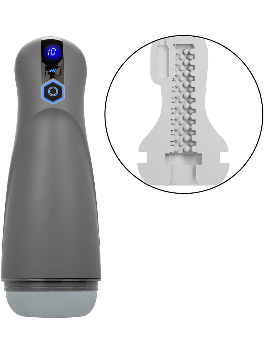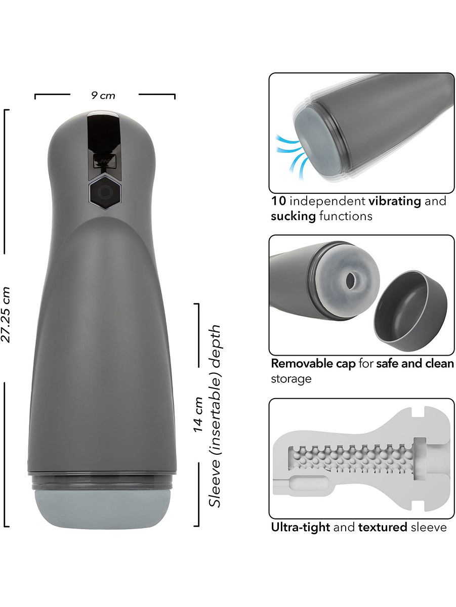 The rechargeable masturbator comes with an ultra-tight and textured sleeve that mimics real-life sensations for maximum pleasure. With two independent motors controlling its two functions, you can customize each session to suit your needs.