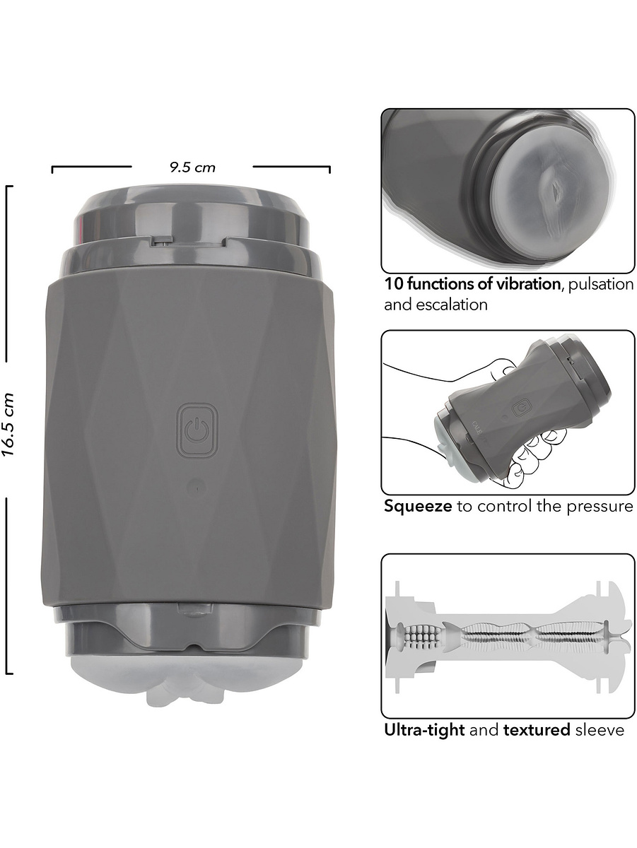 Milk Master Vibro Squeeze squeeze masturbator with double ends which makes it perfect for all penis lengths and easy to clean. It has a super tight and structured sleeve that provides fantastic stimulation together with water-based lubricant. With an EZ grip feature you get a firm and comfortable grip for maximum control. Squeeze with your hand for a tighter feeling. The removable lids make storage safe and hygienic.