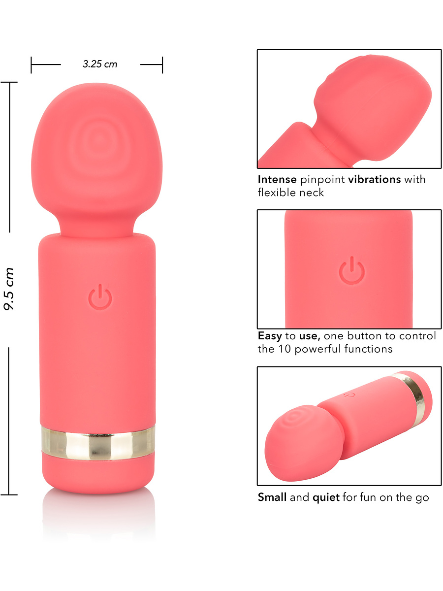 Slay Exciter is an elegant and discreet Magic Wand in mini format with a flexible neck and a textured top that delivers intense vibrations with precision. Use it against the clitoris or other erogenous zones. With the button on one side you can control its 10 powerful functions of vibrations, pulsations and escalation.