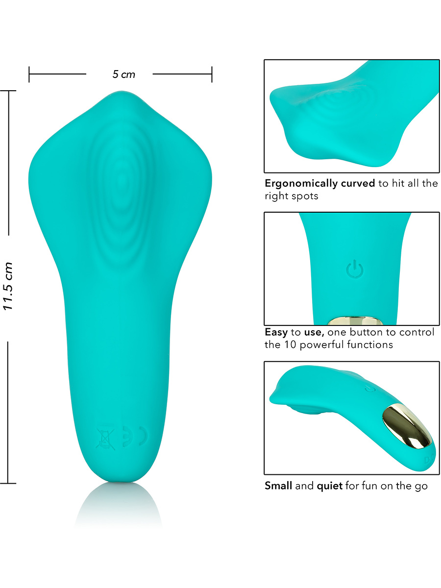 It has a curved design with a textured bulge on one side of the top that gives you pleasant stimulation. The wings at the sides give a nice enveloping feeling the one you press it against the clitoris. It can be used both as a regular mini-vibrator or as a discreet panty-vibrator so you can enjoy wherever you are.