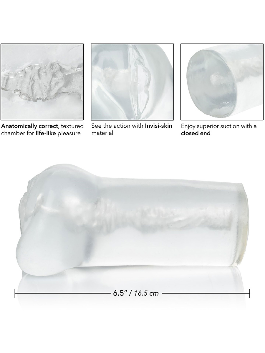 The anatomical design features an inviting vaginal opening with defined labia that enhances the sensation. Inside, you’ll find textured nubs and ridges that stimulate all the way in. The closed back creates a natural vacuum for a more intense feeling. Made of InvisiSkin, a super-soft TPR-material, it is both flexible and realistic, giving you an experience that feels as close to the real thing as possible. The transparent design also lets you watch every movement.