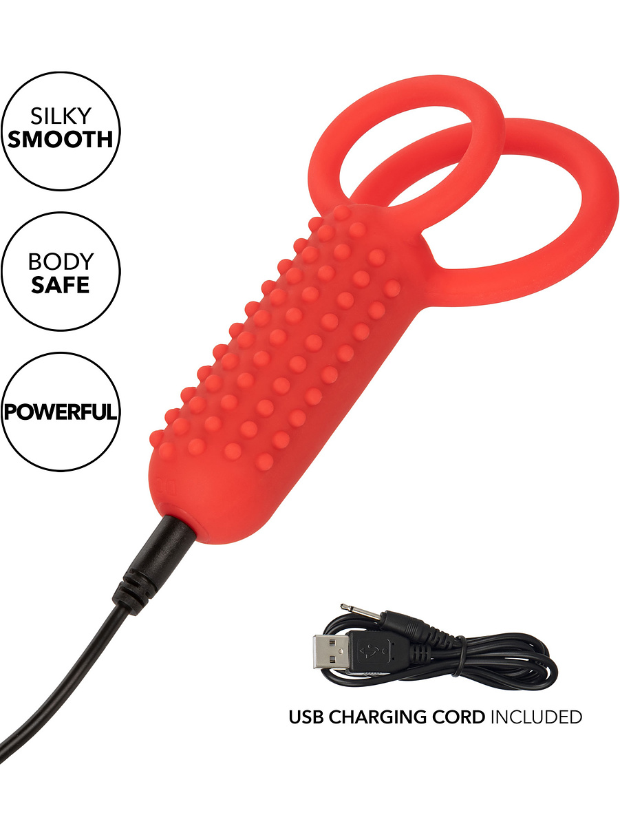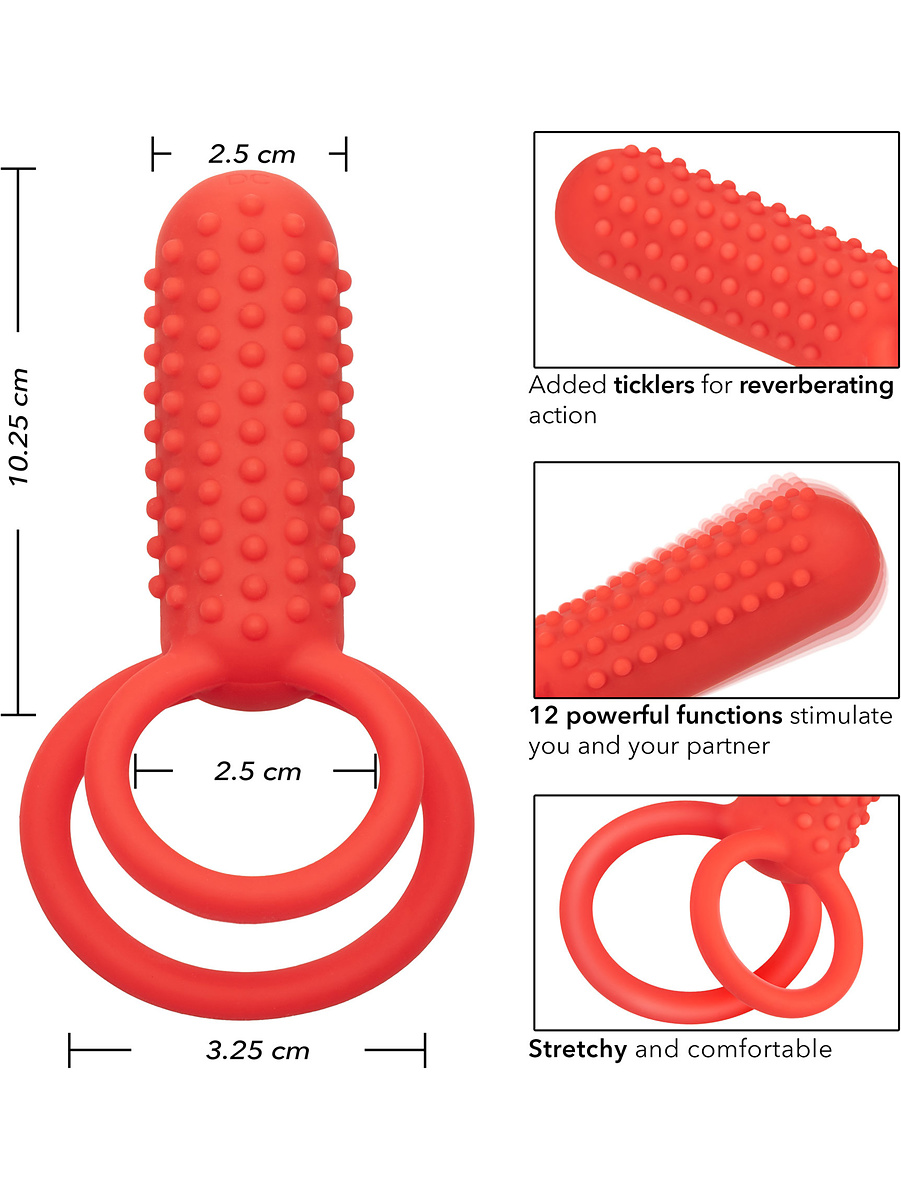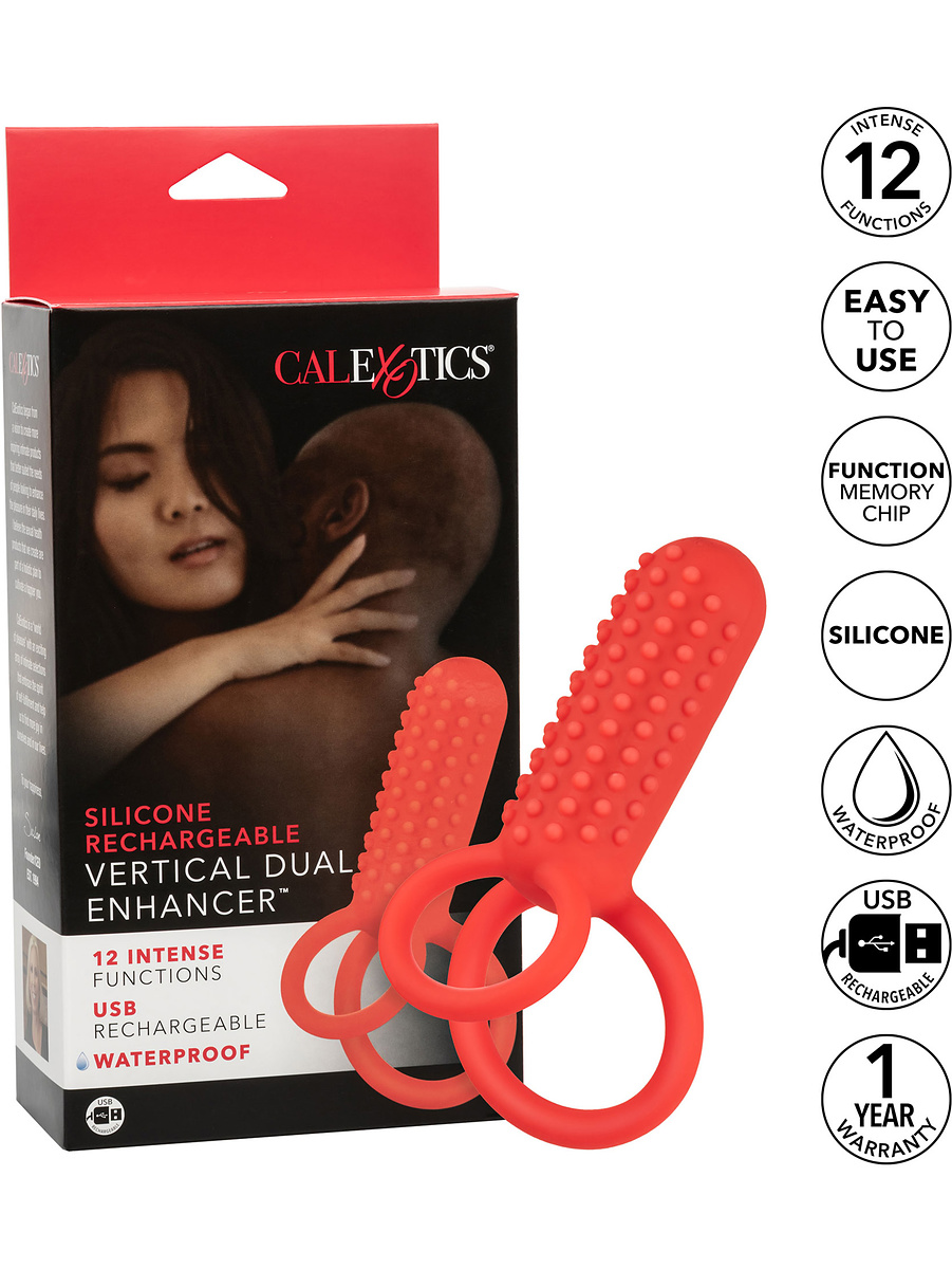 The Vertical Dual Enhancer is a rechargeable cockring that offers dual rings, 12 intense vibration-functions and a vertical stimulator with knobs for great stimulation. It is perfect for both beginners and experienced people who want to spice up their sexlife with extra pleasure.