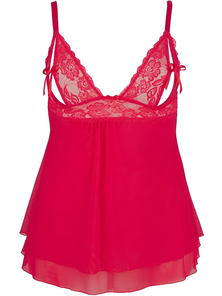 This lovely red Babydoll with beautiful lace patterns across the breasts has slits over the cups which are tied with small ribbons into cute bows. The narrow shoulder-straps are adjustable and there are hook fasteners at the back for the best fit. The slightly flared skirt part has two layers of powernet that beautifully adorns your body together with the lace details at the top.