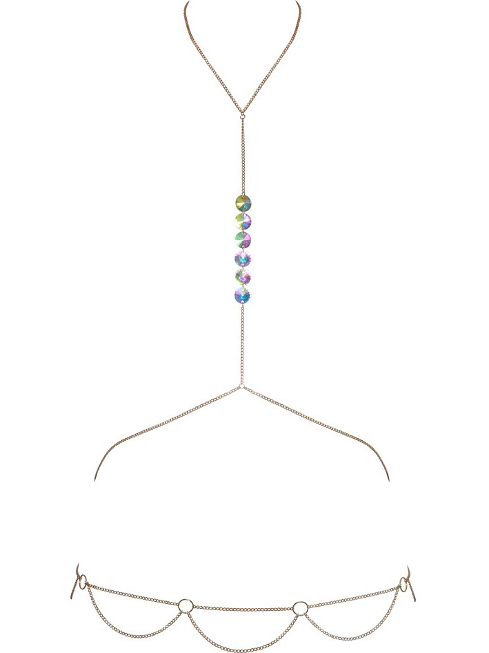 This is a gold-colored body chain from Cottelli Accessoires with 6 large shimmering hologram gems between the breasts. The body chain goes around the neck, between the breasts and around the waist and hip. Along the chain around the hip there are rings and chains that hang down for an extra stylish look.