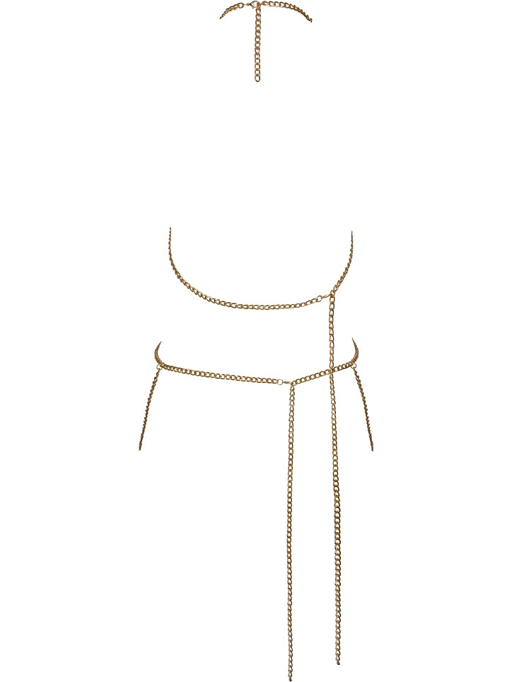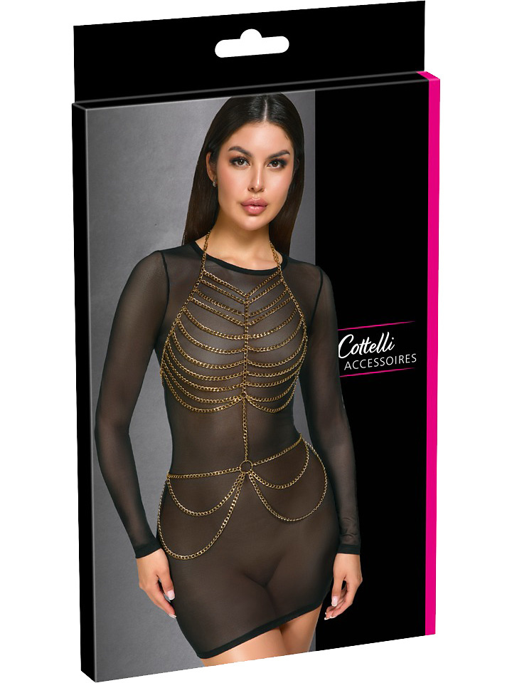 This is a gold colored body chain from Cottelli Accessoires with a two piece look. The chains hang sexy over the breasts and hips. It can be adjusted and adjusted at the neck and at the back with three safety-hooks.