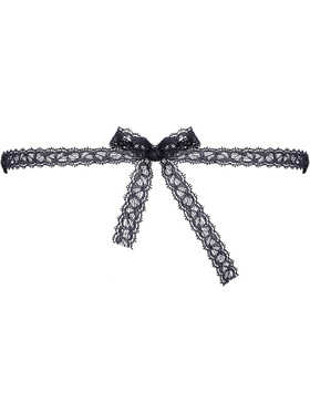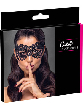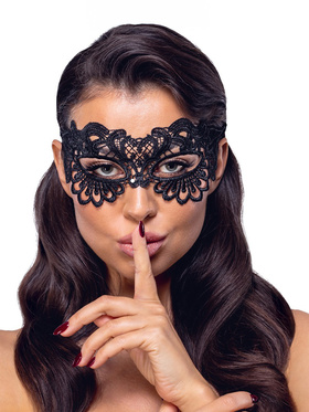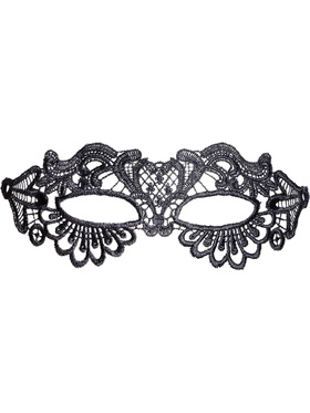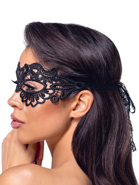 The mask is made of soft and supple polyester material with lace-embroidery. It is equipped with open eyeholes and is tied with a thin, decorative lace ribbon. It is light, silky against the skin and fits comfortably without chafing - even during prolonged use.