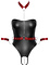 The Bodyn also comes with a sexy red and removable bondage harness with silver-colored metal accessories. The chains with small carabiners are detachable from the harness so that the necklace, waist belt and handcuffs can also be worn on their own. The collar and waist-belt are adjustable with snaps while the shackles are adjusted with Velcro.