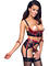 This set includes a lightly padded and open underwire bra, suspender with garter belt and crotchless thong that combines stretchy lace with a beautiful matte finish.