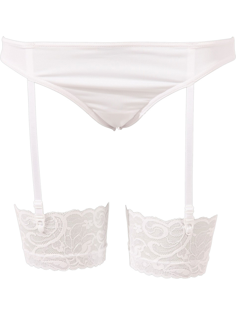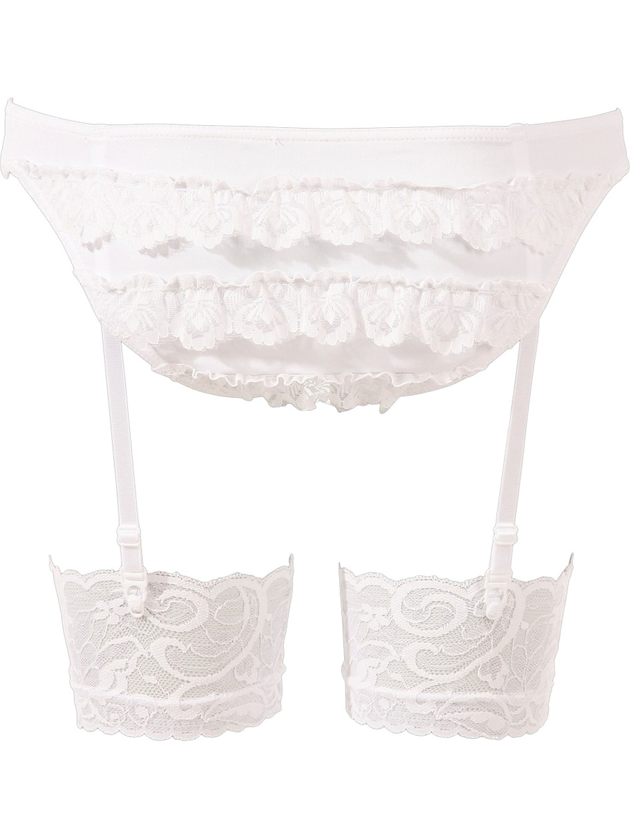 The panties have cute frills over the bottom that become visible thanks to the cut out of the skirt. The briefs also have stocking holders to keep the accompanying stockings with beautiful lace-details over the thighs in place.