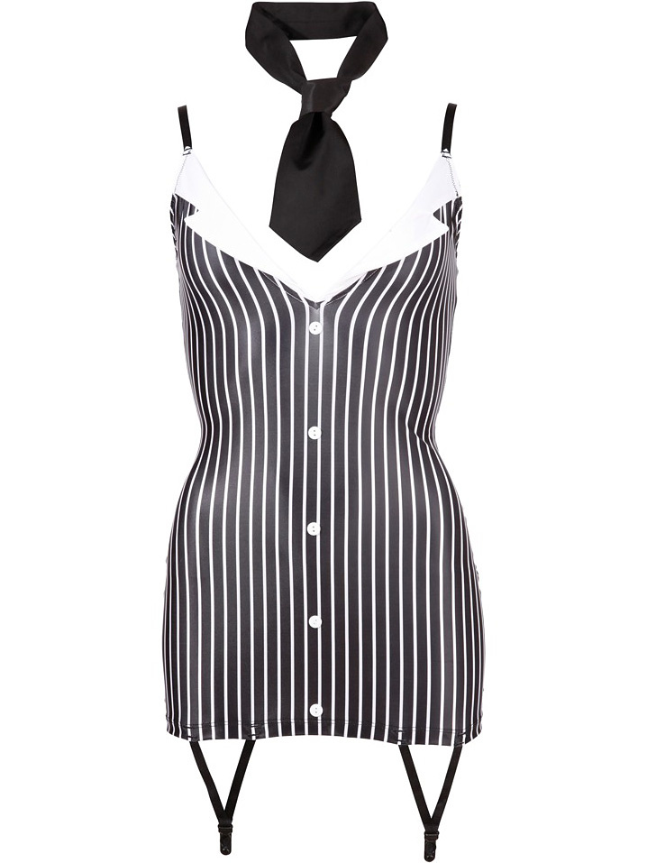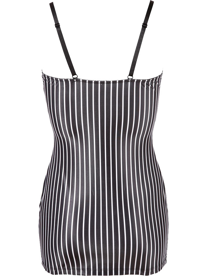 This sexy outfit is perfect for exciting roleplay. Here you get a tight-fitting dress with white stripes and adjustable shoulder-straps. The front has decorative buttons and a white collar around the deep neckline. A black tie is also included.