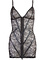 This black dress is made of beautiful lace with a floral motif and straps with a wet look at the front. Your skin will sexyly show through and with the 2-way zipper you can easily open the mini-dress when the urge strikes. The shoulder-straps are adjustable for the best fit.