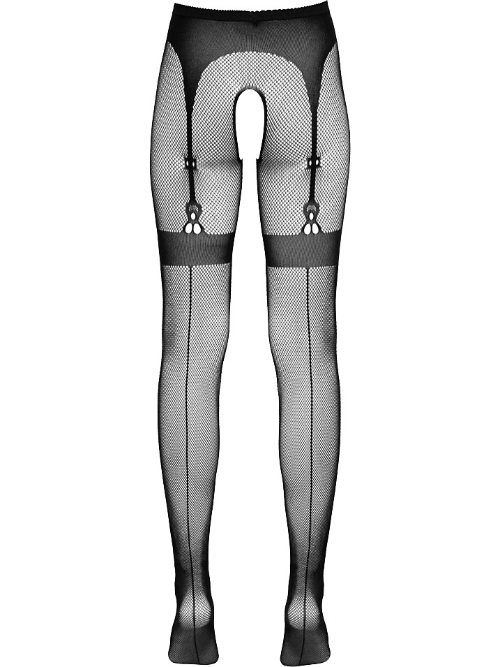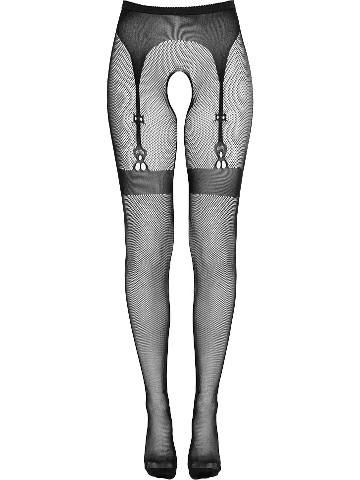 Sexy tights in net design with delicious details like suspenders with garters. At the back, a seam also runs along the legs. The crotchless design is inviting and perfect for spontaneous sex.