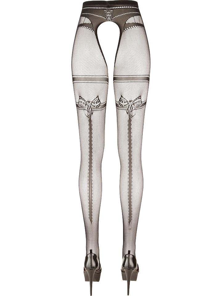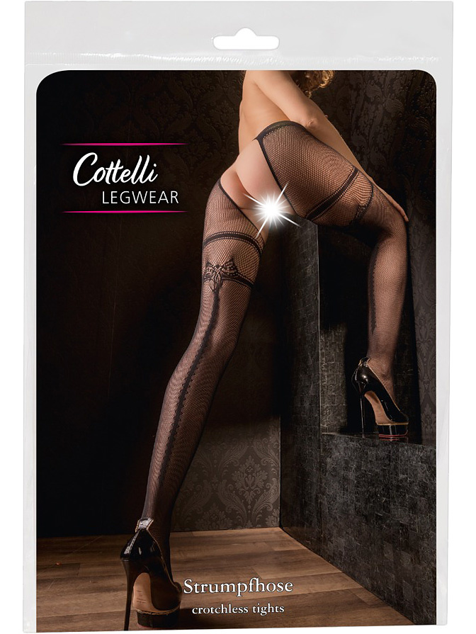 Soft and crotchless fishnet tights from Cottelli Legwear with integrated garter belt and decorative seam at the back.