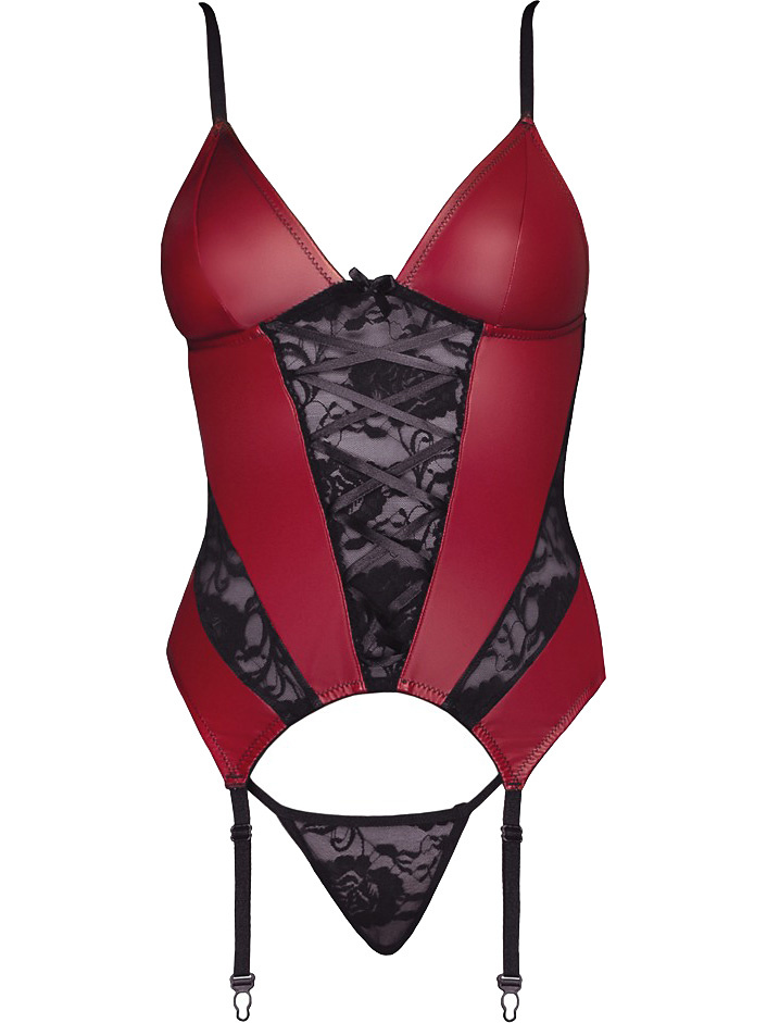 At the front, floral lace details and lacing alternate with red surfaces. At the back there is the fine mesh net and a closure. The shoulder straps are adjustable for a good fit. With adjustable stocking holders, you can easily match your sexy outfit with delicious socks.