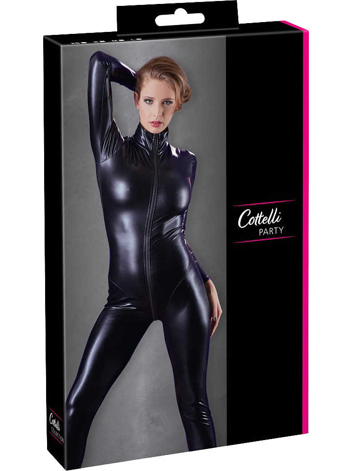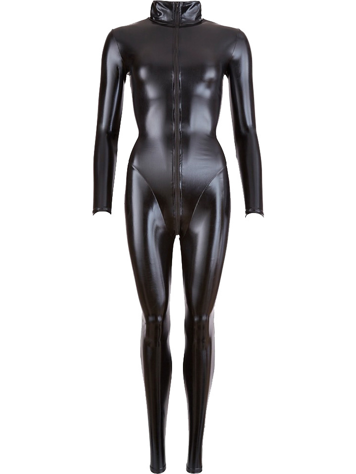 This black jumpsuit has a gorgeous wetlook design with long sleeves and legs and a high collar that covers her entire body. It is a really sexy outfit and adorns the body to perfection.