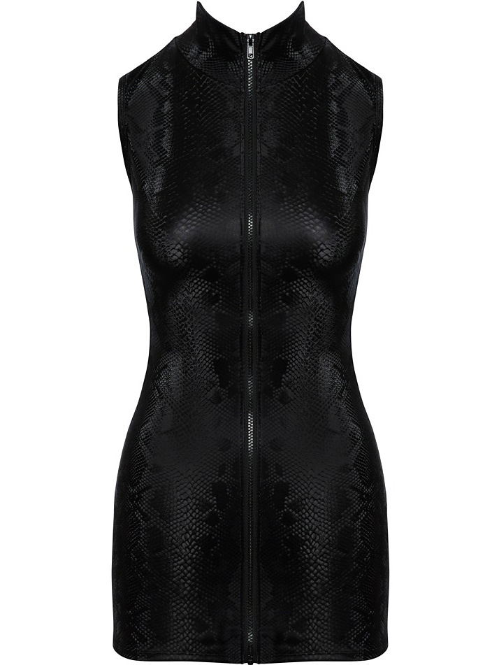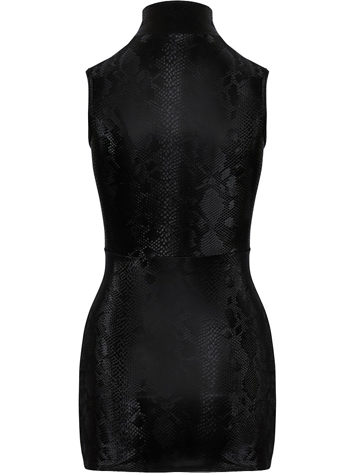 This is a tight, short and sleeveless mini dress in a matte, shimmering snakeskin-look. At the front there is a zipper that goes all the way from top to bottom. The dress is fantastically stretchy for a snug fit with high comfort.