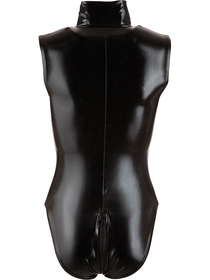 This is a sexy black bodysuit with a high collar and a black 2-way zipper that goes from the collar, between the legs and stops over the butt. It allows you to easily open up the whole body or just leave your most intimate parts visible.