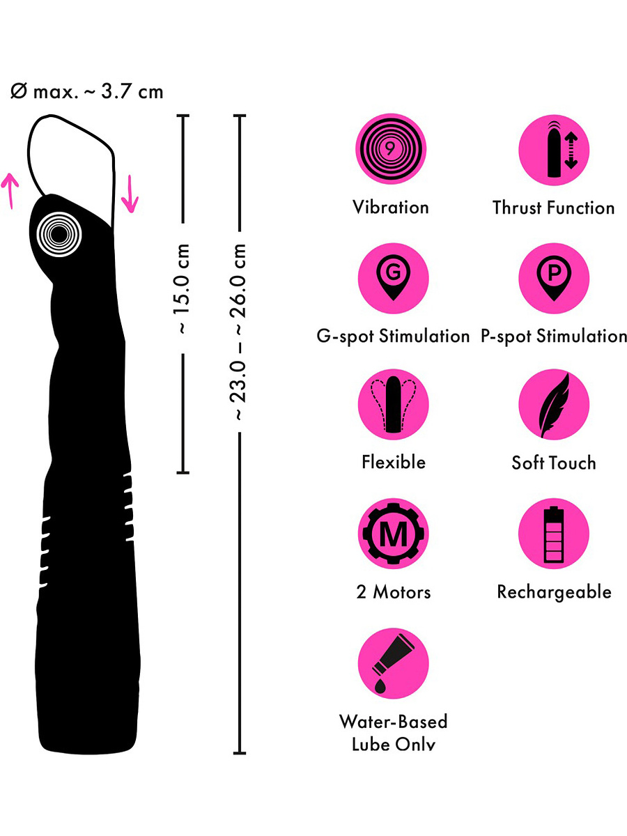 This unique thrusting vibrator's flexible shape ensures precise and comfortable stimulation of both the woman's G-spot and the man's prostate. With a stroke length of over 3 cm and a removable suction cup, it offers maximum versatility.