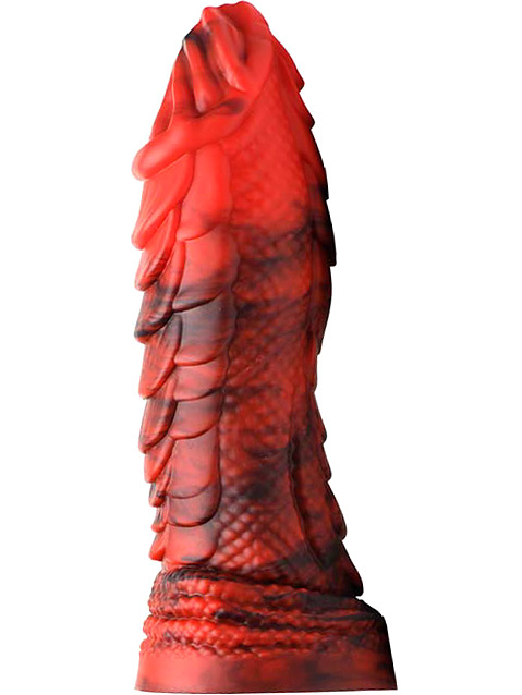 Fantasy Dildo : This dragon-like dildo is fiery red and deep black with a thick shaft and lots of unique scales, knobs, ridges and a slight bend. Perfect for cosplay, role play and fantasy sessions.