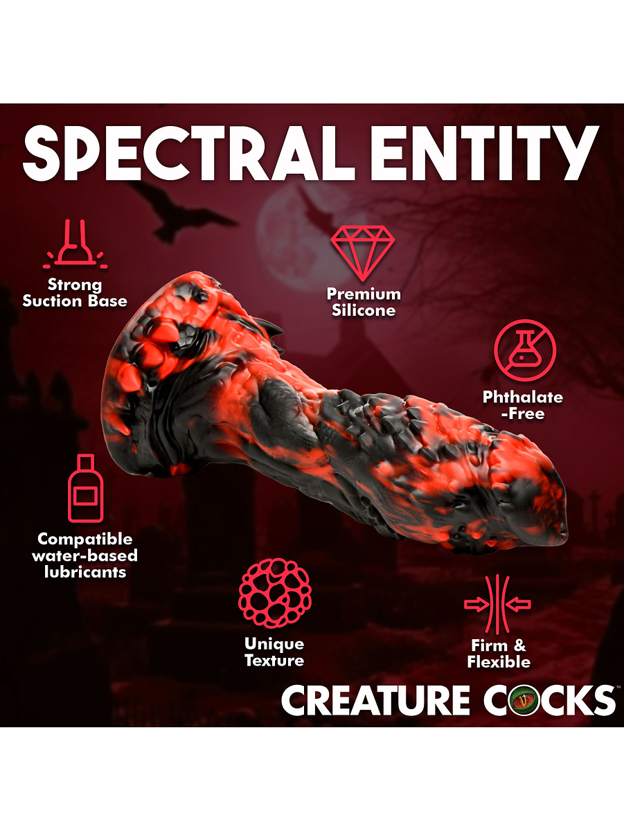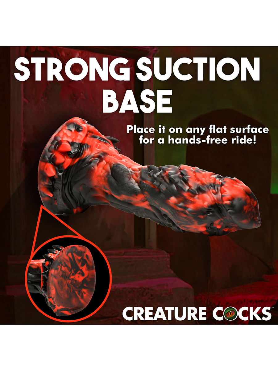 Fantasy Dildo: This red, black, large and textured dildo brings your darkest fantasies to life. Perfect for cosplay, roleplay and fantasy sessions.