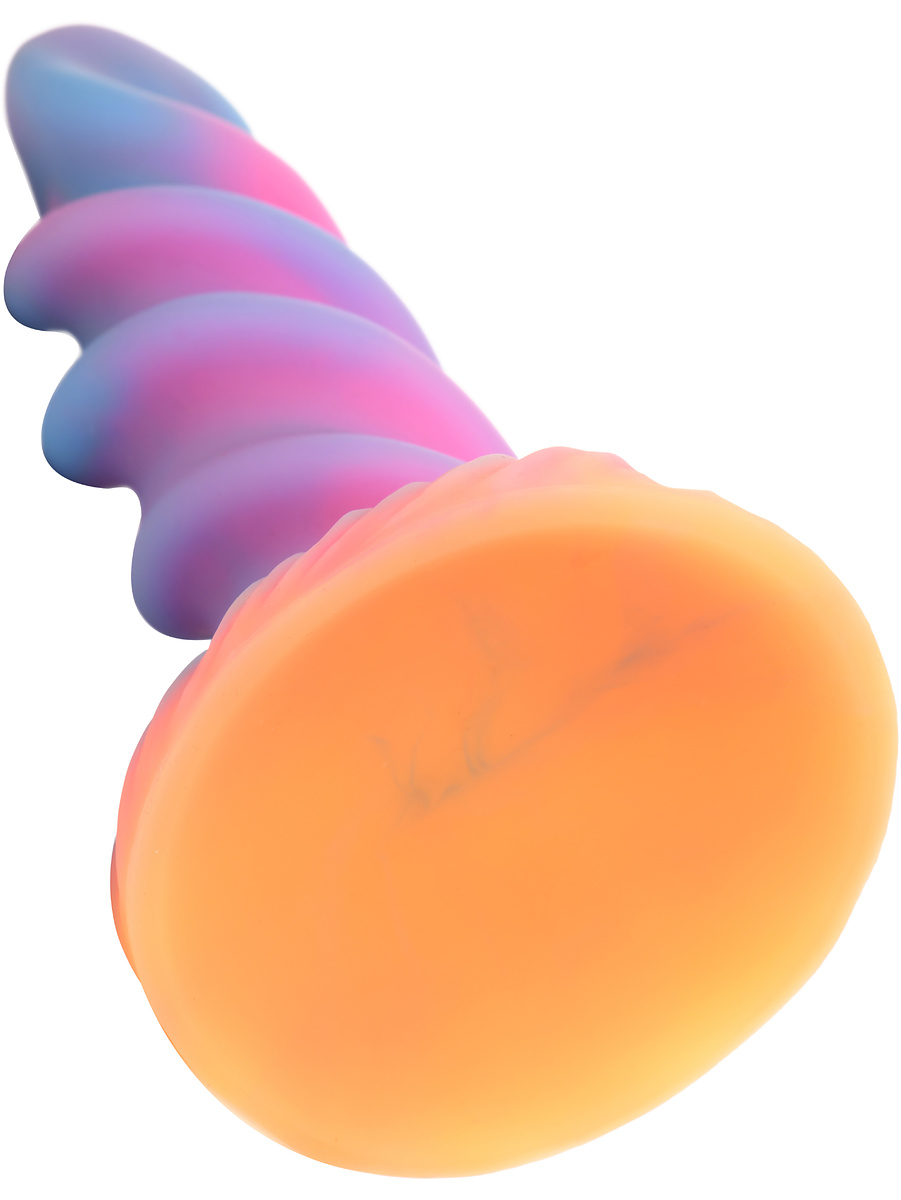 Fantasy Dildo: The twisted horn has magical shades of orange, blue and purple that glow green in the dark. The narrow top provides a comfortable entry and the shaft itself with a spiral pattern has soft, round contours.