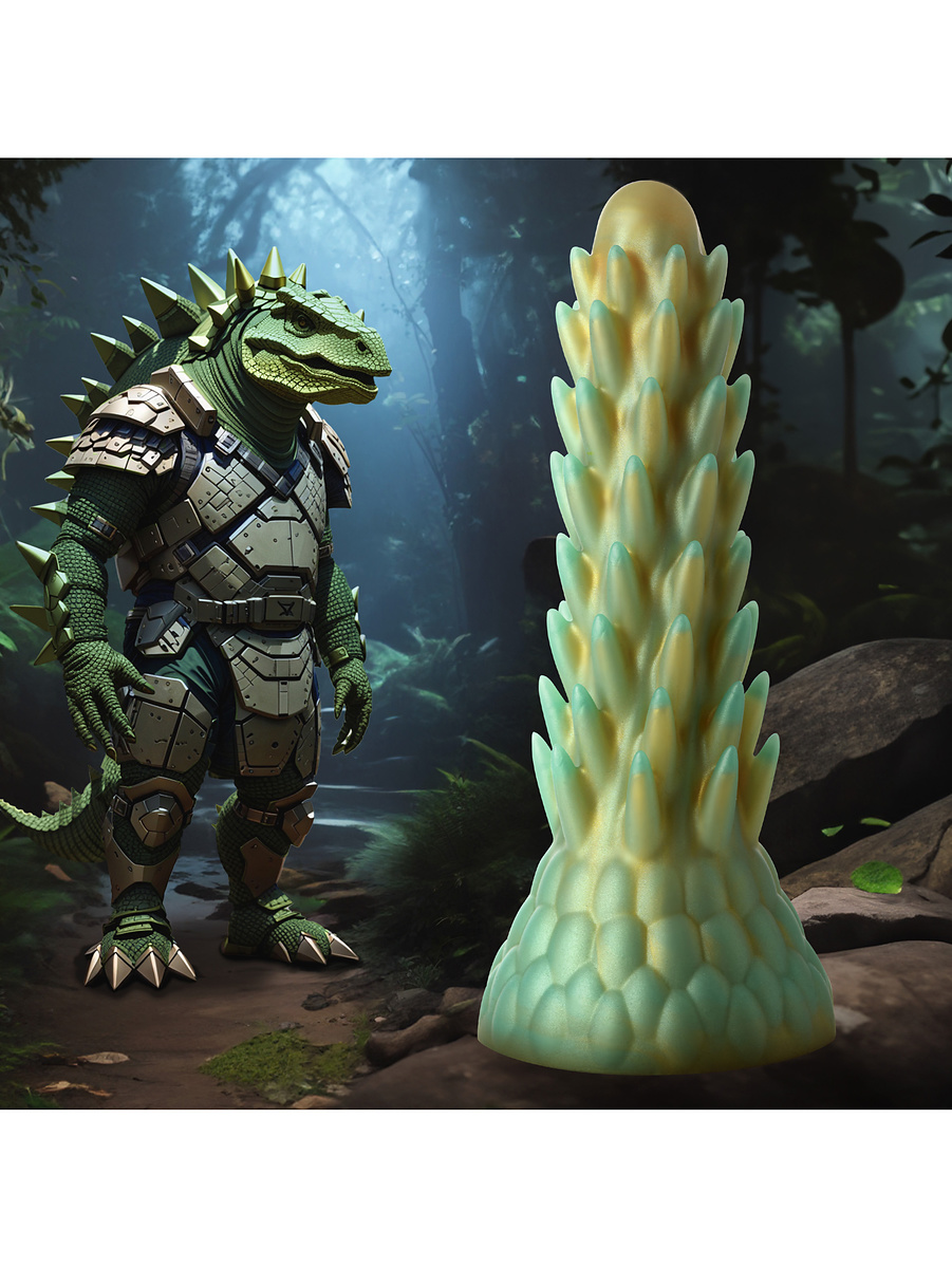 Let your imagination run wild with this reptilian dildo, inspired by the spiky tail of Stegosaurus. It will treat you well and provide a great stimulation while you explore its exciting structures. The delicious gold and green dildo has a tapered tip for a pleasant insertion before widening for a fulfilling sensation. The base is round and covered in scales while the shaft itself has long, rounded barbs that point at you as you let it penetrate you.