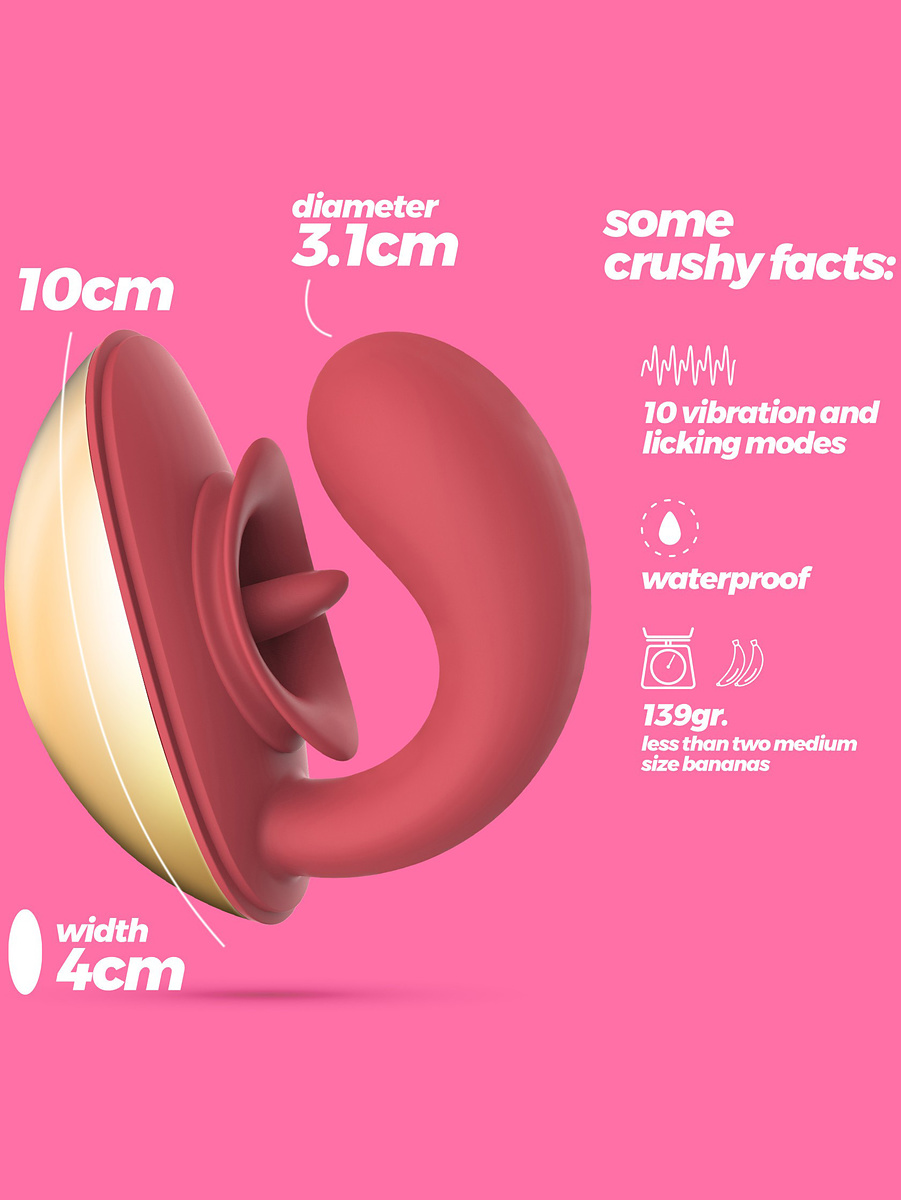 Arcane is equipped with dual motors that deliver 10 powerful vibration-modes in the inner part, while an outer tongue offers 3 different movement-patterns for oral sexlike stimulation.