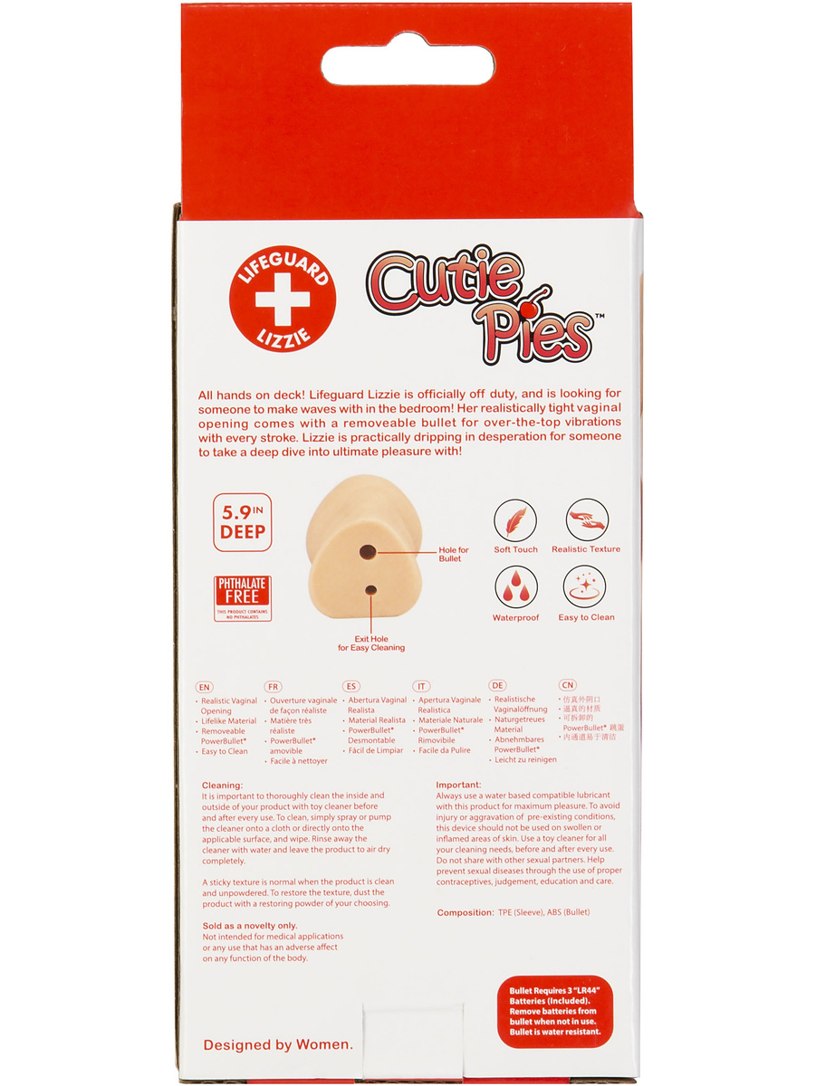 Lifeguard Lizzie is officially on vacation and looking for someone to make waves with - in the bedroom. Her tight opening is shaped like a realistic vagina, approximately 15cm deep, uniquely structured and open at the back for easy cleaning.