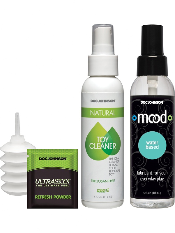 In addition to three dildos, strap-on harness with accessories and external suction cup, 118 ml of water-based lubricant is also included. In addition, Ultraskyn Refresh Powder and 118 ml Natural Toycleaner are included so that you can easily clean and take care of your new toys.