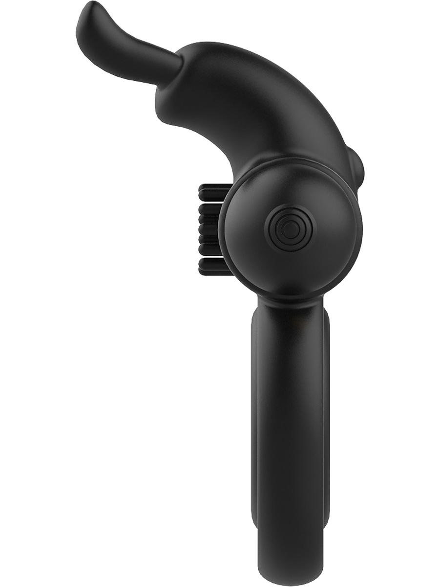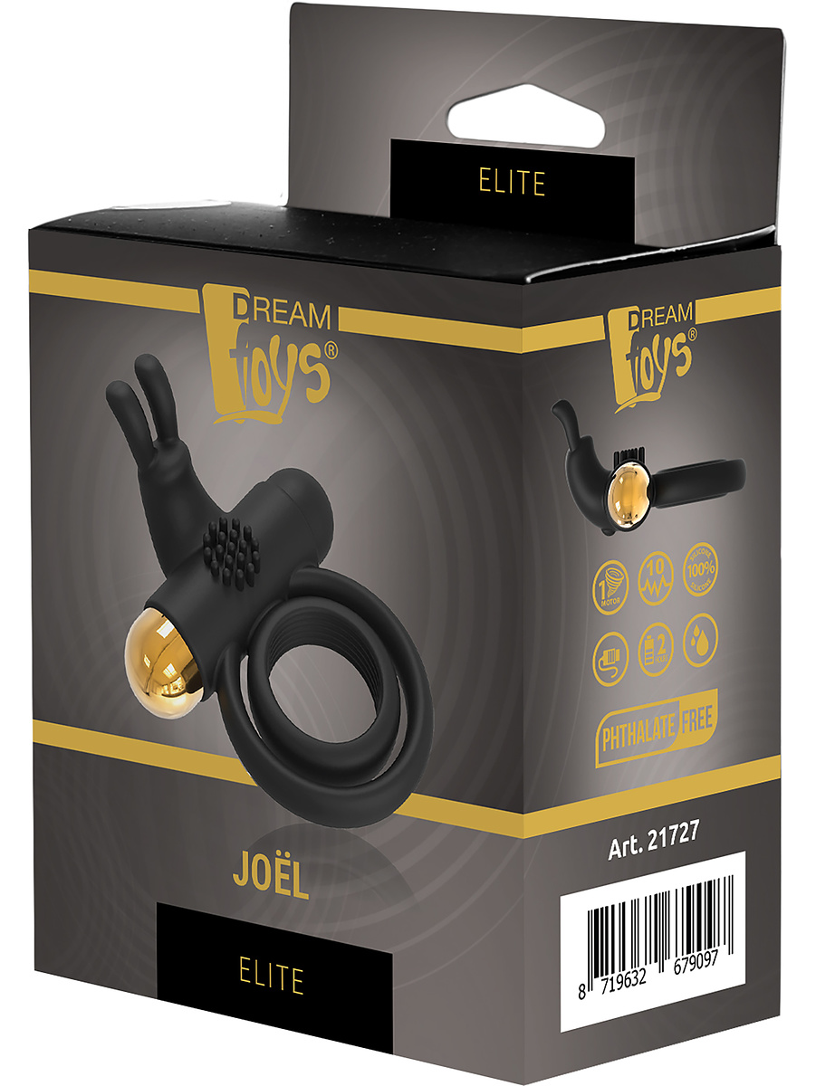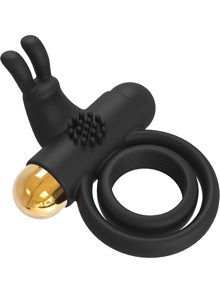 Joel is a vibrating cockring with an elegant, gold-colored bullet-vibrator that matches well with the ring's black and silky silicone. The sleeve that holds the bullet-vibrator in place is adorned with two bunny-ears and a knobby texture that stimulates your partner's clitoris during penetrative sex.