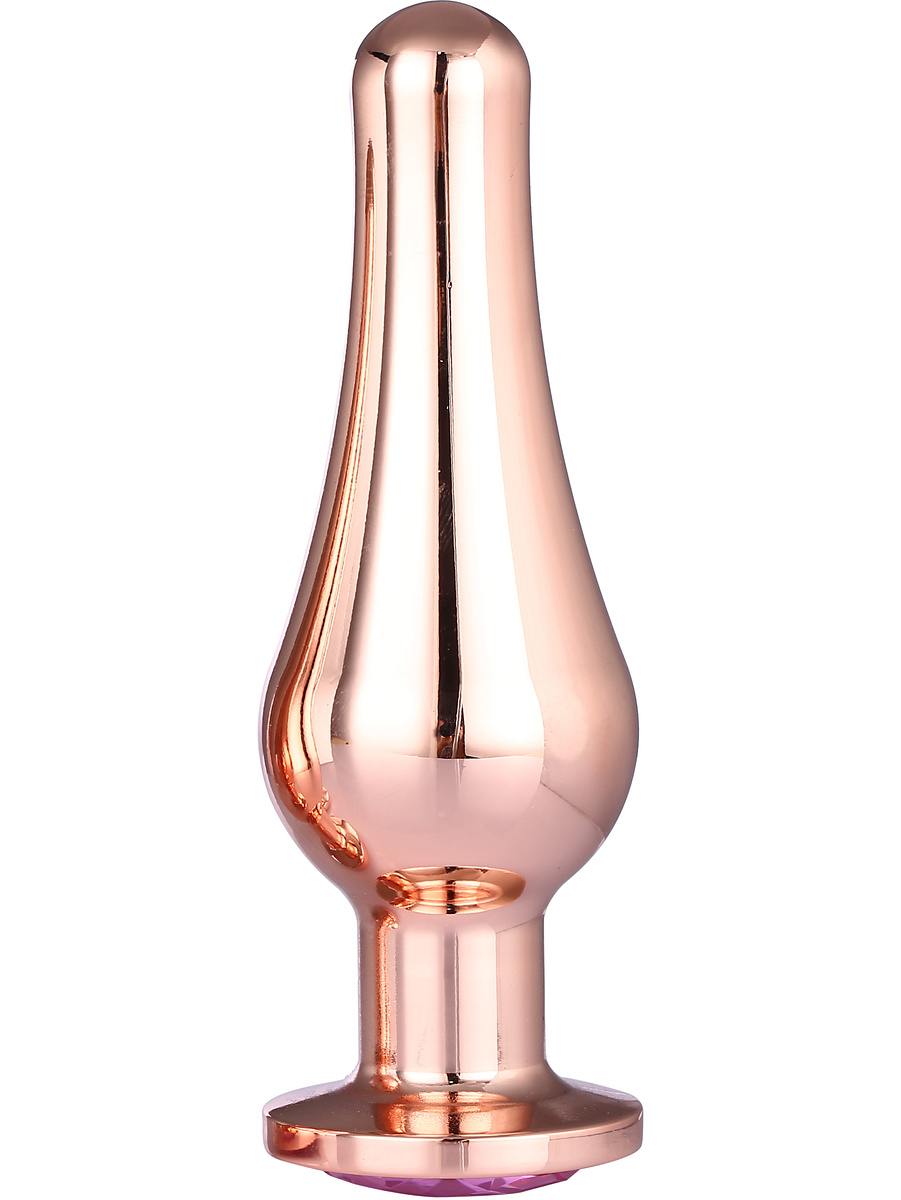 The butt plug has a delicious rose gold color that matches with the pink stone at the bottom. It is made of light and seamless aluminum which, together with the long and tapered top, provides a comfortable entry. The wide and round base prevents it from slipping too far in at the same time as the jewelry sits comfortably between the buttocks.