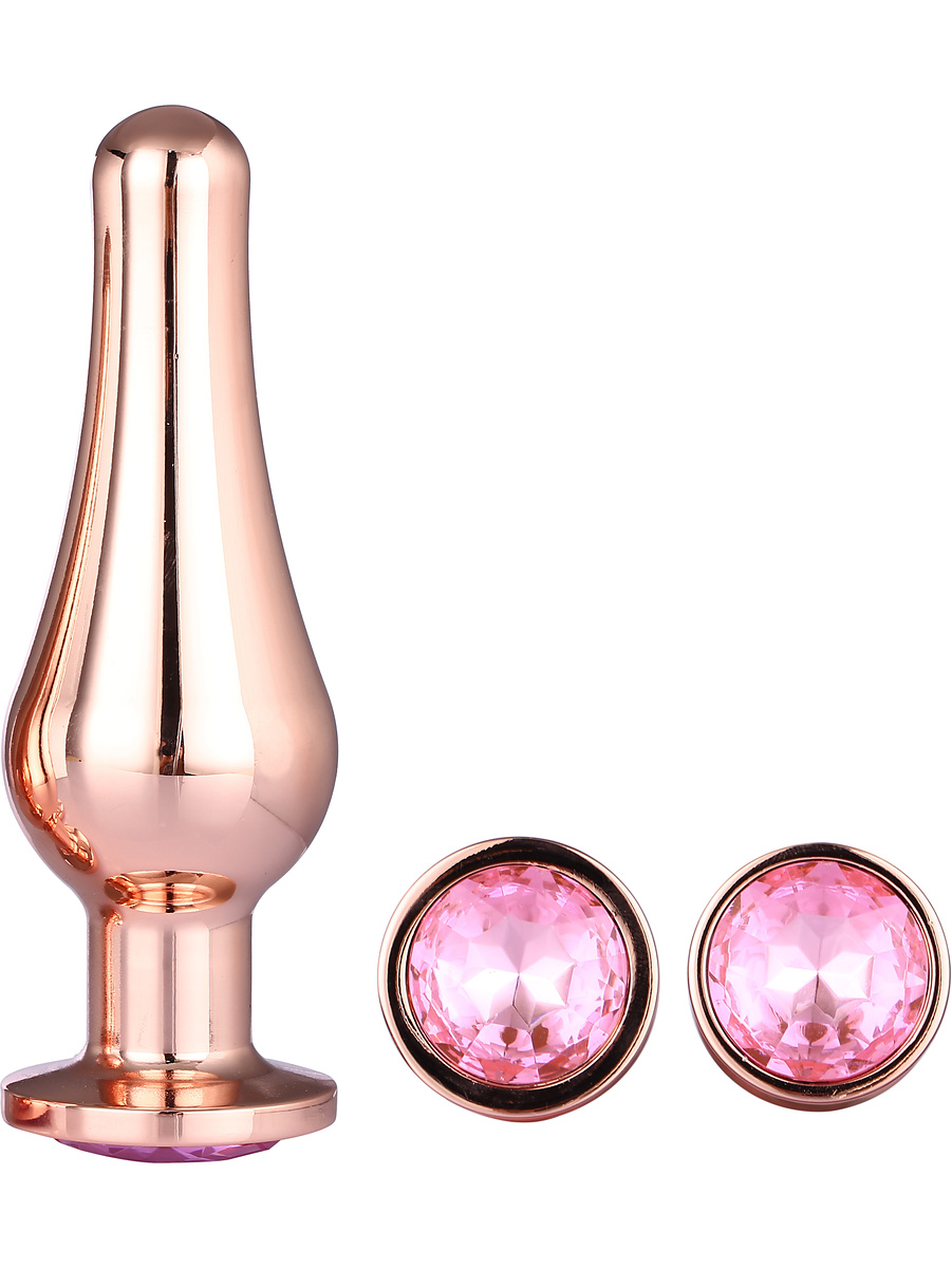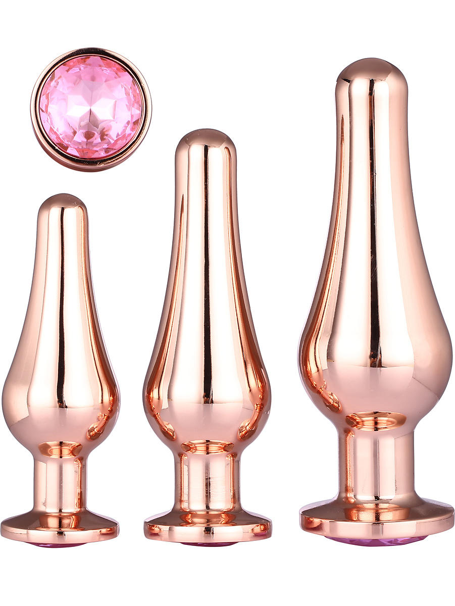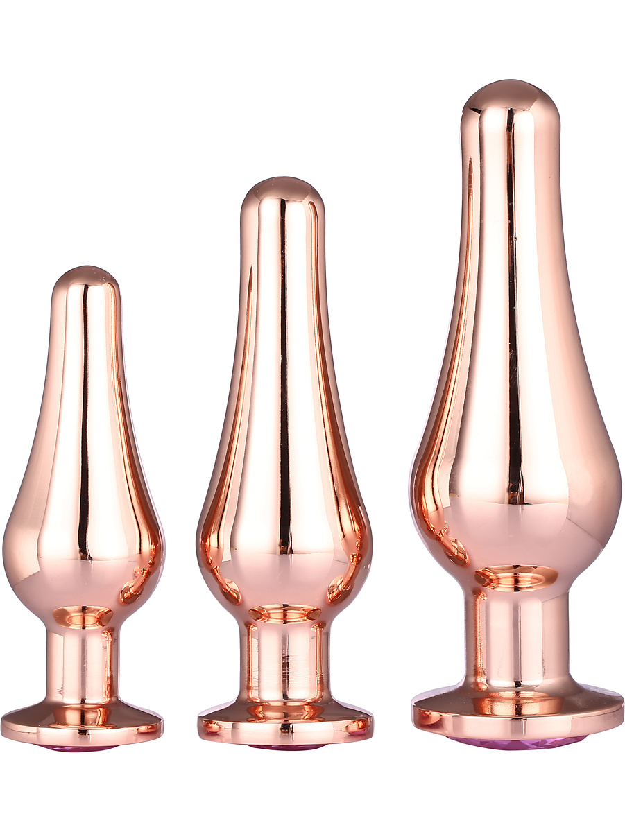 Each butt plug have a delicious rosegold-color that matches the pink stone at the bottom. They are made of light and seamless aluminum which, together with the long and tapered top, provides comfortable entry. The wide and round base prevents them from slipping too far in while the jewelry sits comfortably between the buttocks.
