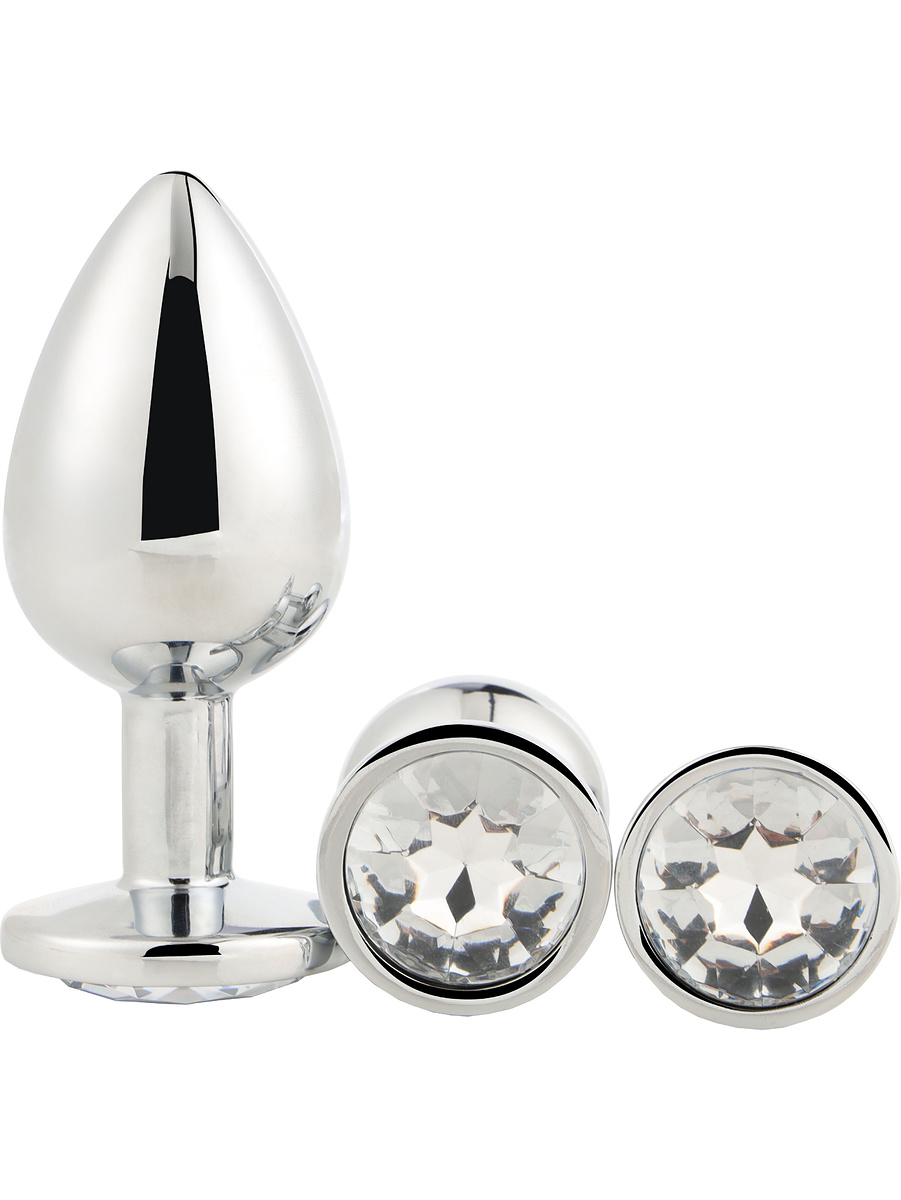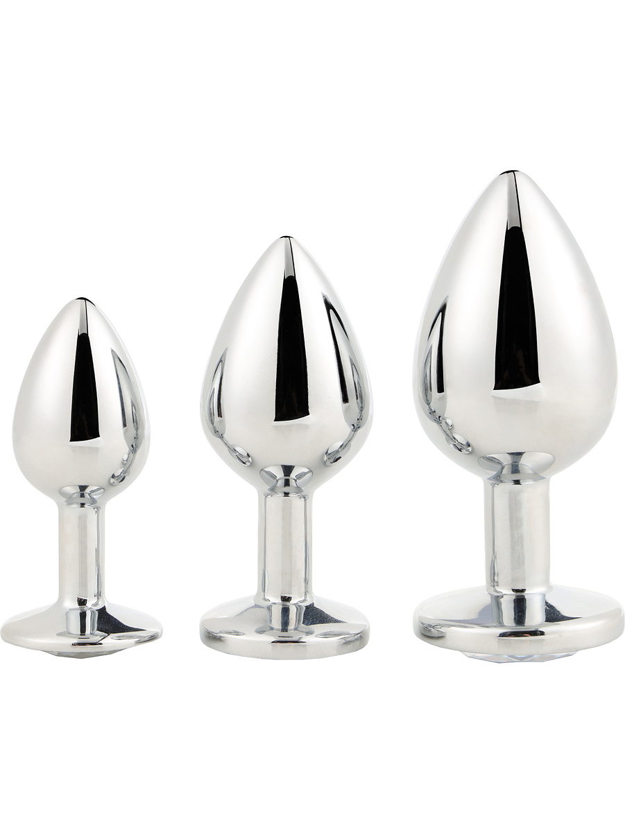 Each butt plug have a delicious silver color that matches the transparent stone at the bottom. They are made of light and seamless aluminum which, together with the tapered top, provides a pleasant entry. The wide and round base prevents them from slipping too far in, while the jewelry sits comfortably between the buttocks.